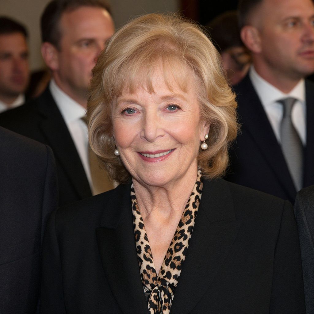 Photograph of an elegant older woman with short, wavy blonde hair and fair skin, smiling warmly. She's wearing a black blazer over a leopard-print blouse and pearl earrings. The background is slightly blurred, showing several men in dark suits and ties, suggesting a formal event. The lighting highlights her cheerful expression and stylish appearance.