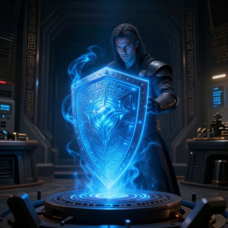Shield creator standing in a futuristic forge, crafting an elaborate, glowing shield with ethereal blue energy swirling around, set in a high-tech workshop filled with ancient runes and advanced machinery, cinematic lighting.