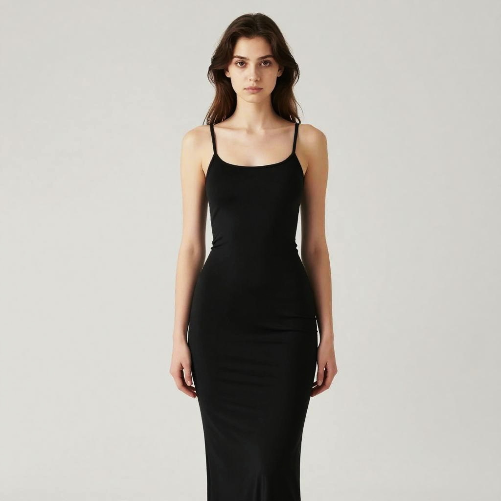 Photograph of a young woman with light skin and dark brown, wavy hair standing against a white background. She is wearing a form-fitting, sleeveless, black dress with thin straps, highlighting her slender figure. Her expression is neutral, and she stands with her arms relaxed by her sides. The lighting is even, eliminating shadows and emphasizing the simplicity and elegance of her attire. The white background creates a stark contrast, making her and the dress the focal points of the image.