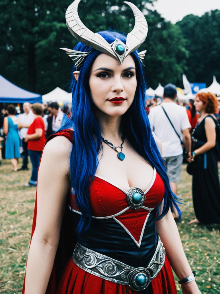 Woman in Lilith Goddess Costume, candid cosplay portrait at festival