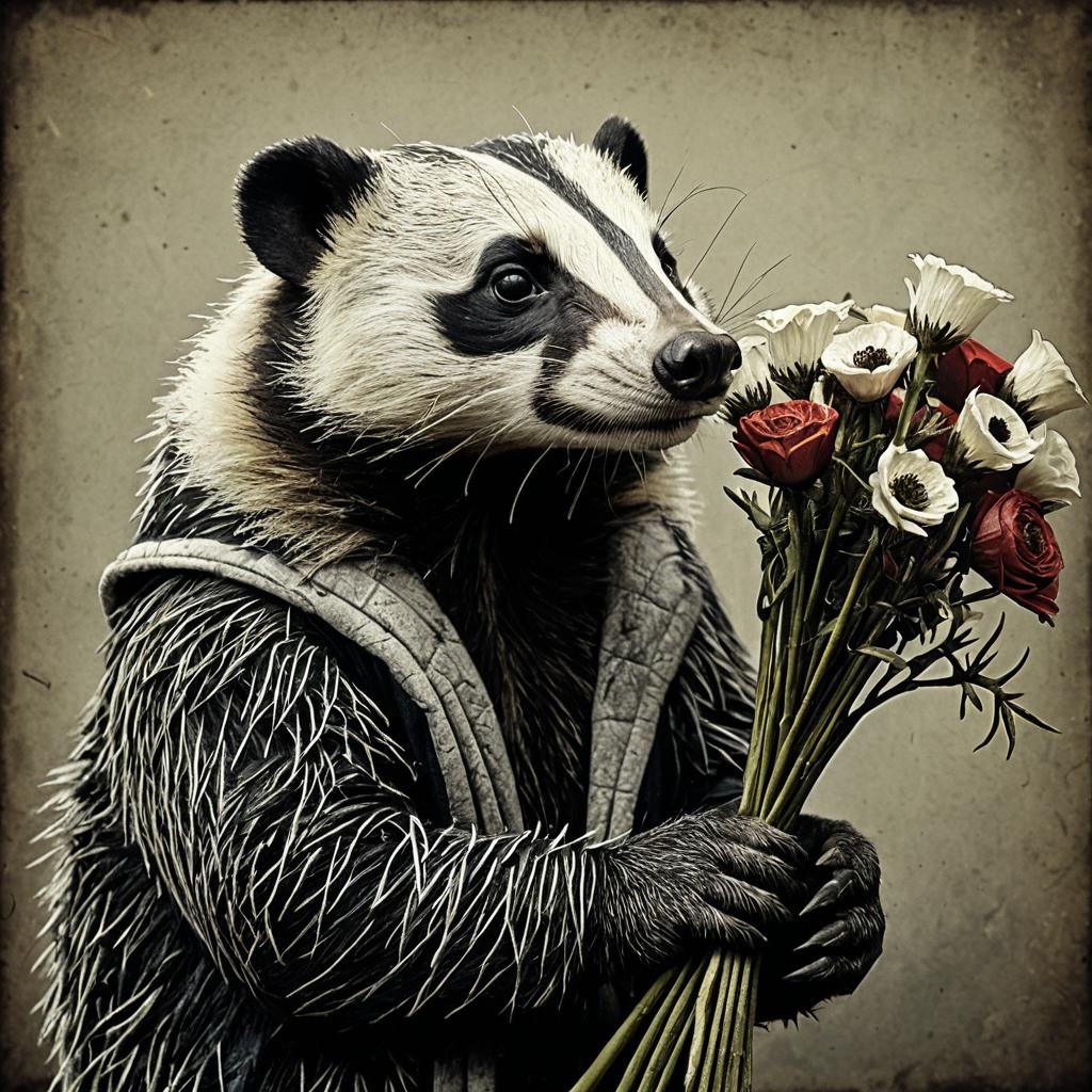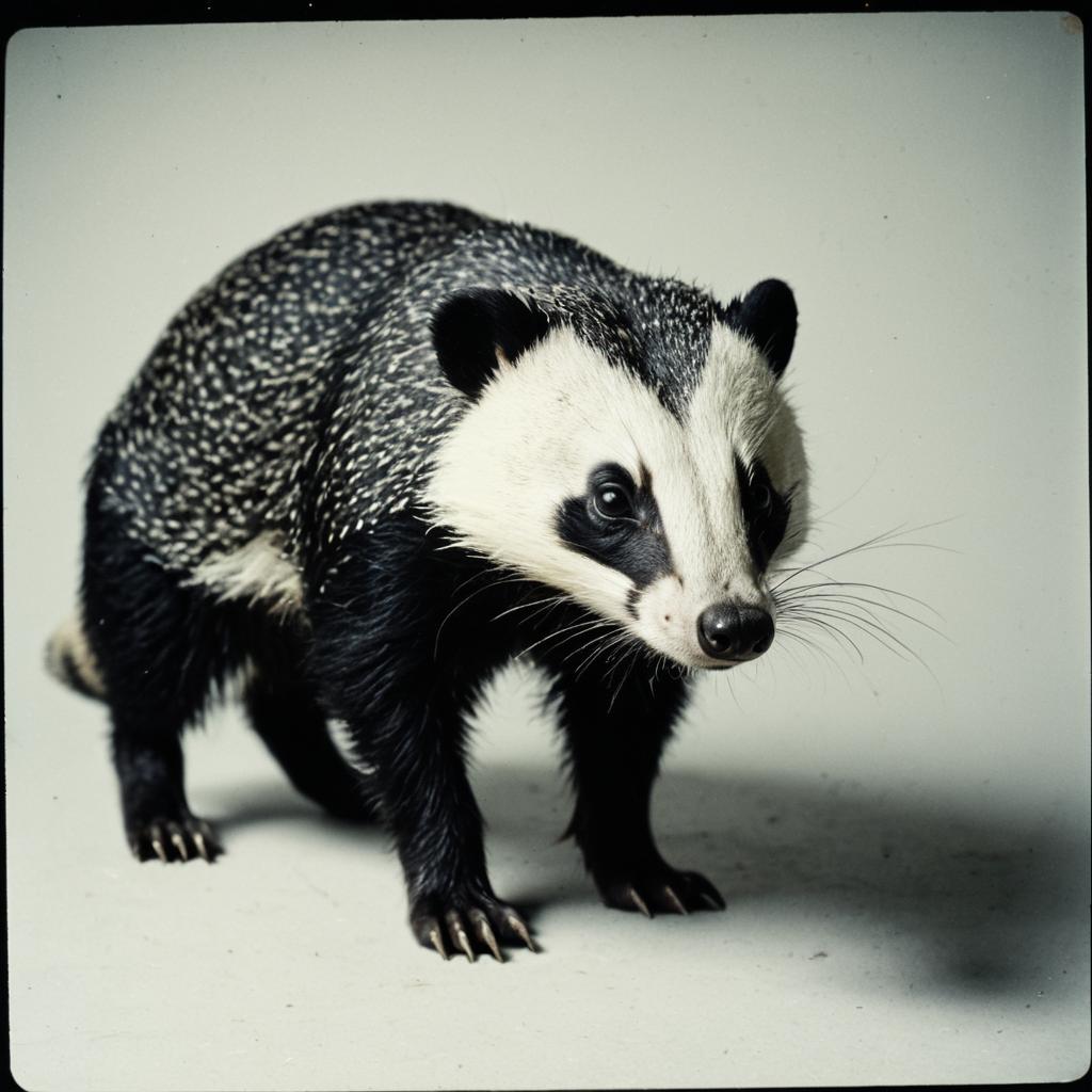 Studio photograph of a fictional alien animal with features similar to a badger, including a black and white patterned fur, a white face with black markings around the eyes, and a robust body covered with dark fur and speckles.