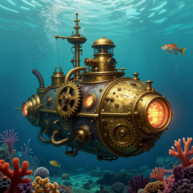 Concept drawings portraying a steampunk-inspired underwater exploration vessel, complete with brass gears, pipes, and glowing portholes, surrounded by vibrant marine life and coral reefs, rendered with rich textures and a blend of vintage and futuristic elements.