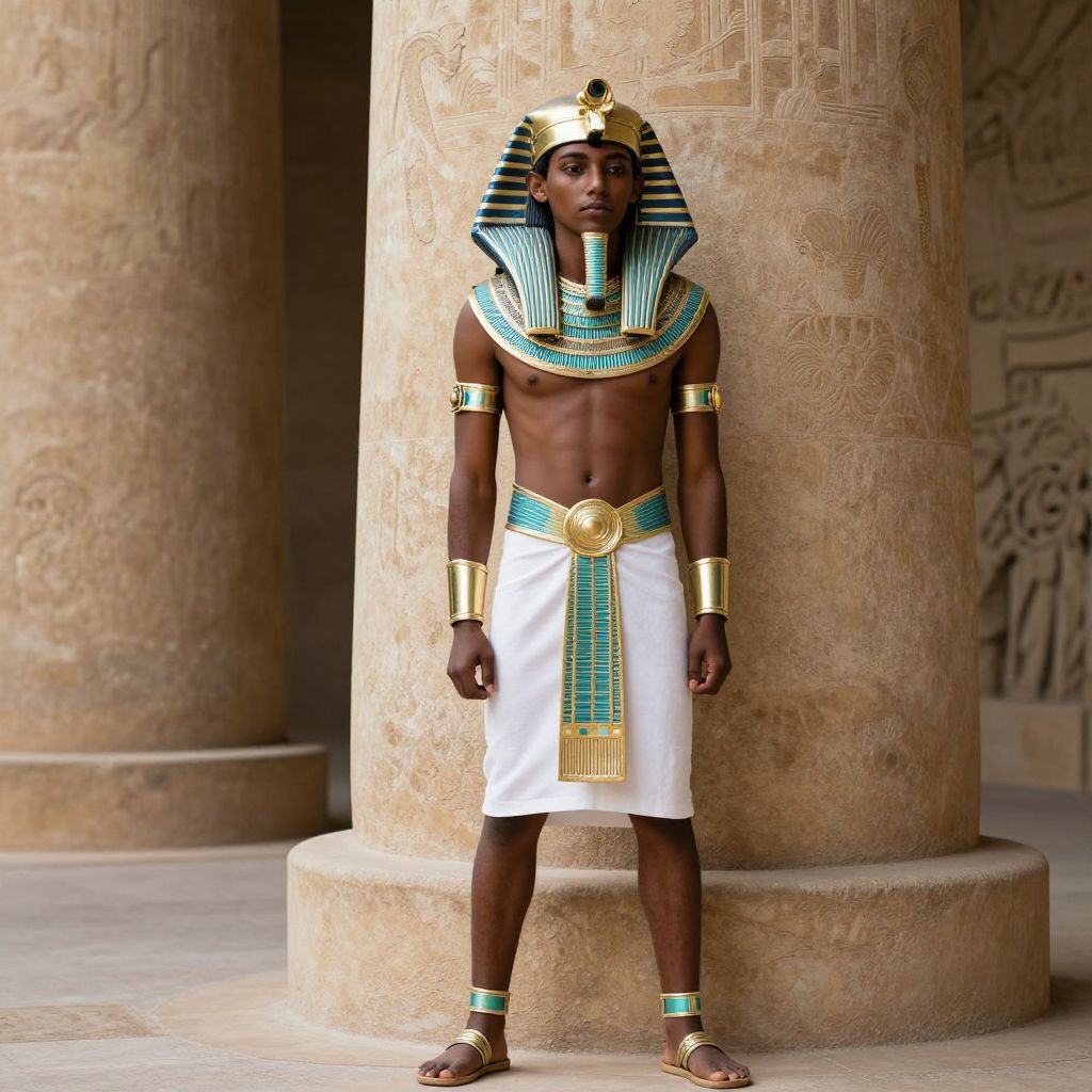 Egyptian god costume man, 1boy, solo, male focus, egyptian clothes, dark-skinned male, dark skin, egyptian, pillar, realistic, bracer, column, standing