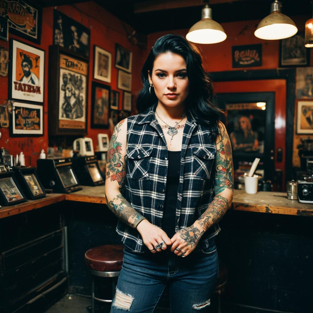 Sassy and trashy photograph of a confident punk rocker, with spiked hair, studded leather jacket, and combat boots, in a dimly lit dive bar with neon signs, cinematic film still, Kodak Portra, rebellious and edgy vibe.