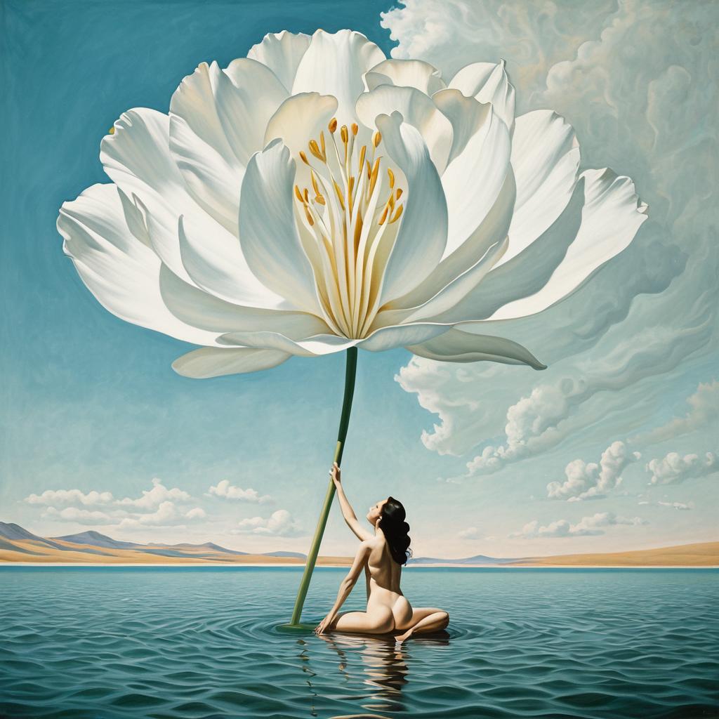 Reimagine the painting The Birth of Venus as if it were created by Georgia O'Keeffe, using delicate portrayal of petals and vast open landscapes with graceful abstraction. This re-interpretation should blend elements of the original painting’s composition with the new artist’s signature style, creating a fresh yet recognizable homage. Ultra-high detail, 8K resolution, capturing the essence of both the original and the re-imagined style.