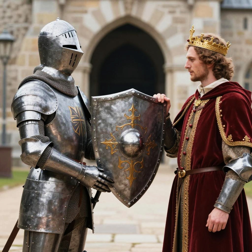 Realistic photo.knight inscribed on an iron shield being given to the duke of Camelot by a squire realistic photo