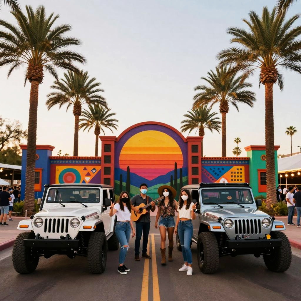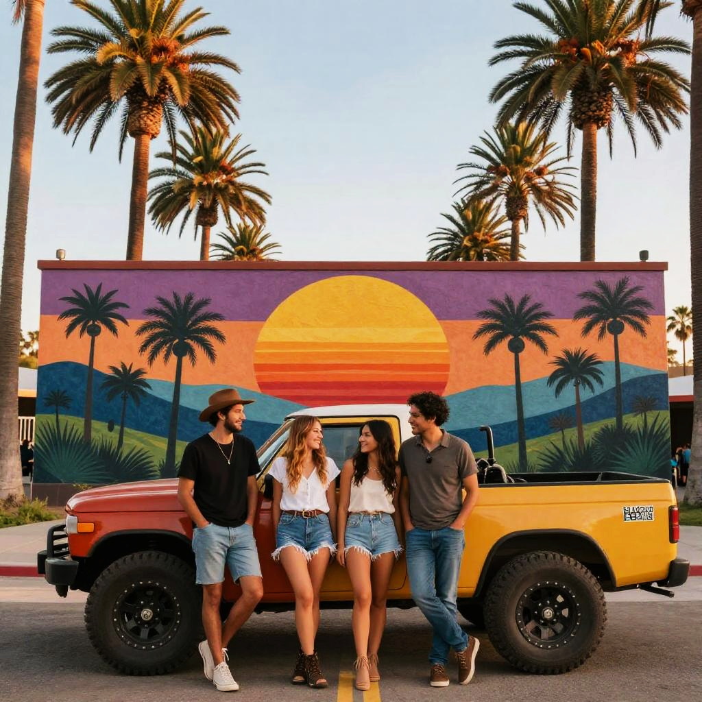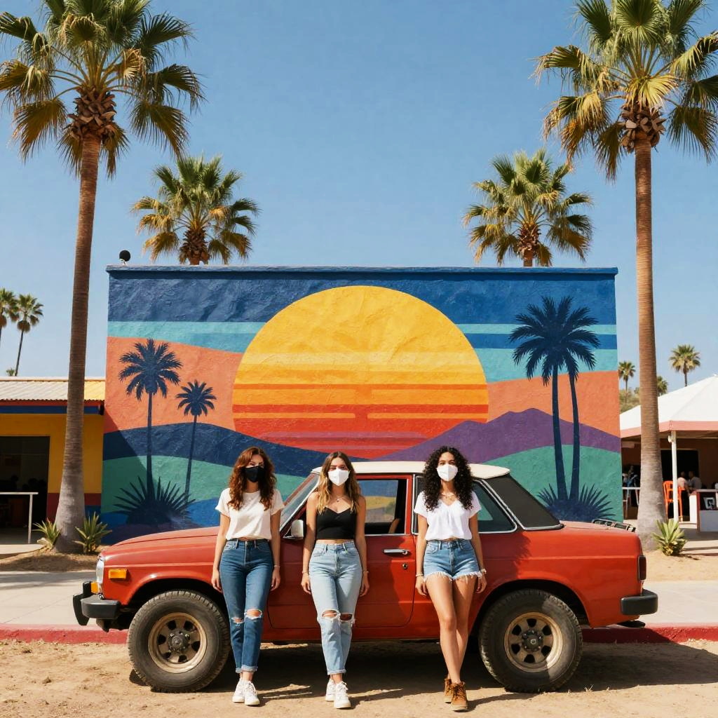 Mexican Muralism Desert Vibes palm trees vibrant sunset Desert Vibes Theme, California, music, fun, togetherness, Covid, best friends, wild adventures, festivals, off-roading, visually stunning, thematic, memorable, brand, mathematics geometric topology :: Must say "Desert Vibes"