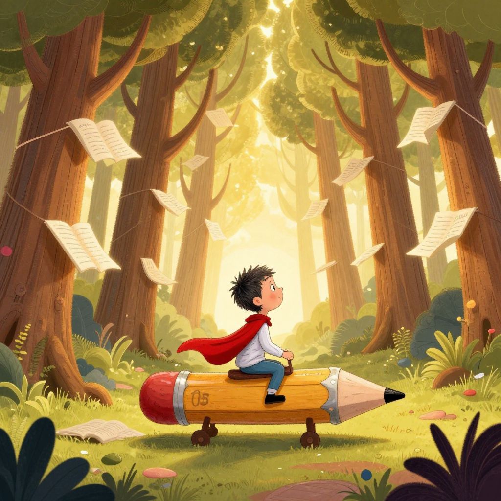 Amidst a dreamlike forest where trees whisper stories and pencils soar like wings, a child embarks on a whimsical journey of imagination, embodying the boundless freedom and wonder of childhood.
