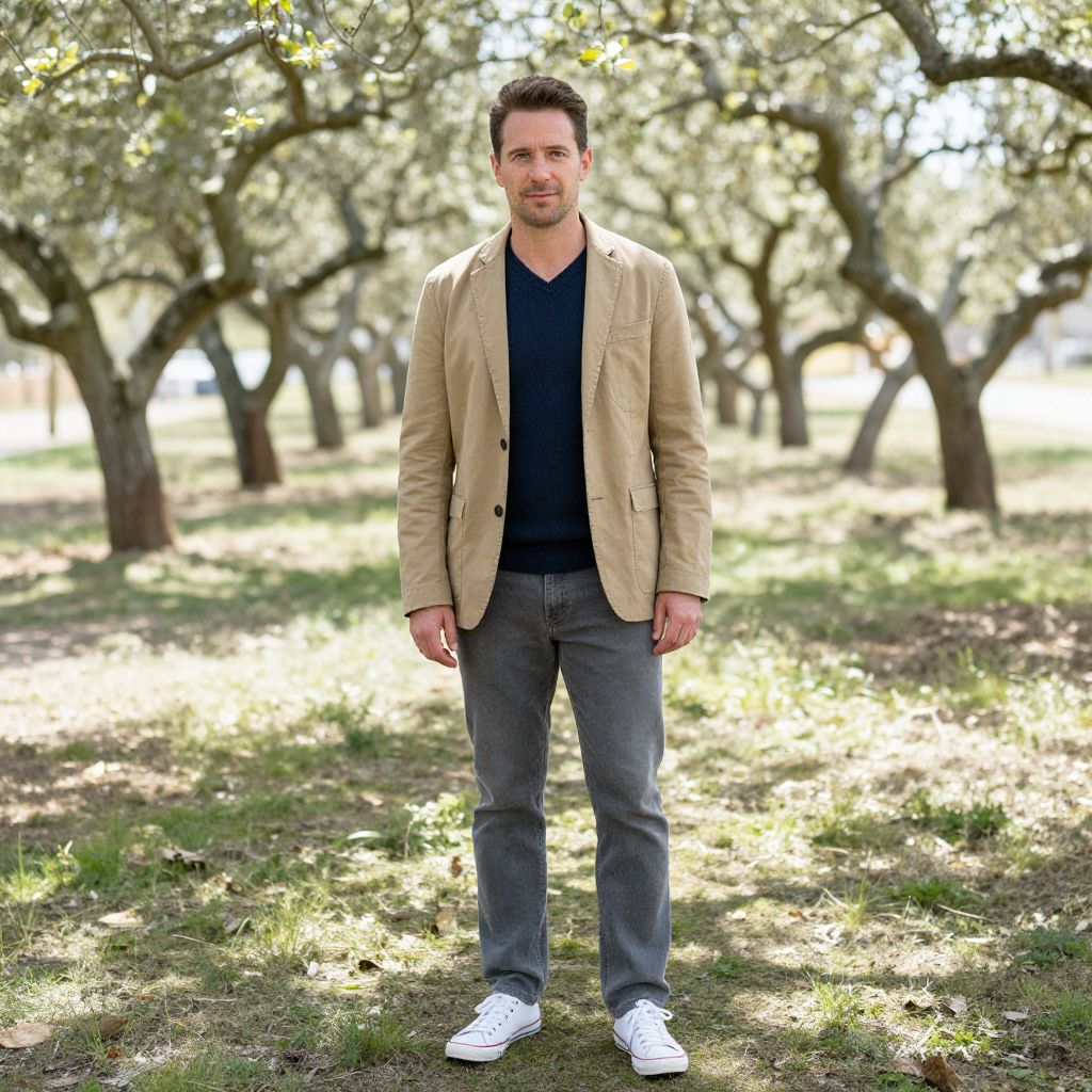 "a man, khaki blazer, navy v-neck linen sweater, gray slim-fit jeans, white canvas sneakers, orchard grove, dappled sunlight, buzzing bees, medium format film, relaxed smile.Man has masculine face and piercing eyes"