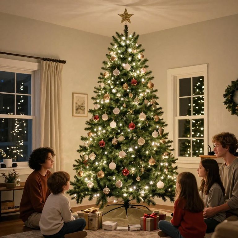Weihnachten family gathering in a rustic cabin, multigenerational relatives exchanging gifts around a decorated Christmas tree, warm golden lighting, homemade cookies on the table, snow-covered landscape visible through frosted windows, heartwarming and nostalgic mood.