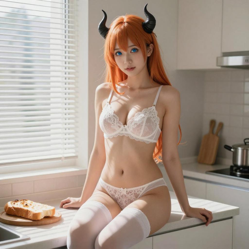 Photograph of a woman with long, bright orange hair and small black horns, wearing white lingerie and thigh-high socks, sitting on a white kitchen counter. She has fair skin, red lipstick, and is looking at the camera with one hand touching her hair. Sunlight streams through blinds in the background, illuminating a plate of food and a loaf of bread on the counter.