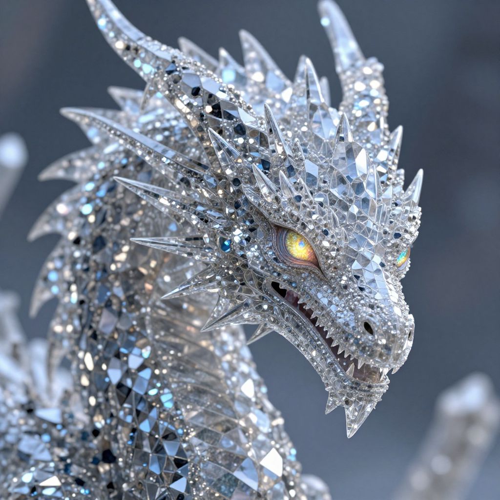 Photorealistic digital artwork of a glittering, silver dragon with sharp crystal scales, glowing yellow eye, and intricate geometric patterns, against a blurred,
