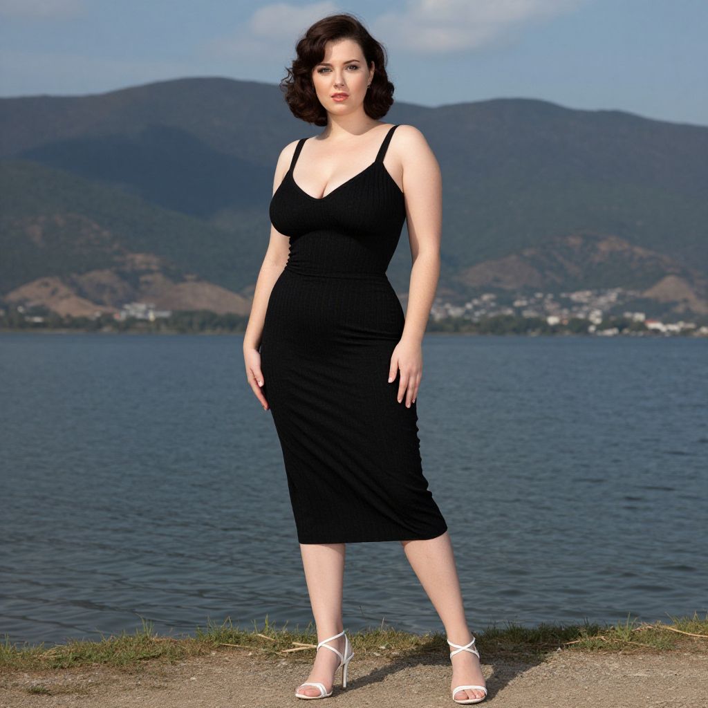 Photograph of a curvy, fair-skinned woman with short, dark brown, wavy hair standing by a lakeside. She wears a form-fitting, black, sleeveless dress with a deep V-neck, accentuating her medium-sized breasts, and white strappy high-heeled sandals. Her expression is neutral with slightly parted red lips. The background features a calm lake with blue water, rolling green hills, and a distant town with scattered buildings. The sky above is clear with a few scattered clouds. The ground she stands on is a mix of grass and dirt, with the lake's edge visible behind her.
