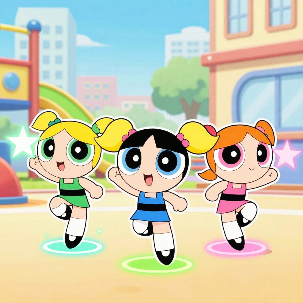 Powerpuff girls generator drawing, three tiny powerful girls with unique elemental powers, vibrant palette, exaggerated cartoon style, glowing effects, action-packed poses, urban playground backdrop, cheerful and fun atmosphere, emphasis on light and motion