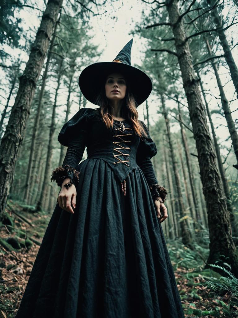 Woman in Woodland Witch Costume, cinematic realism, magical dark fantasy portrait