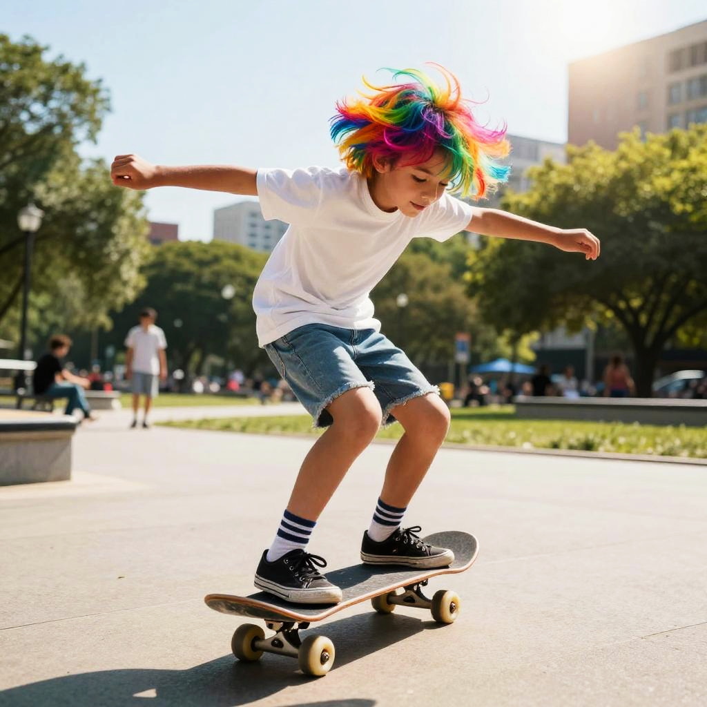 Hand holding skateboard, vintage 80s style, colorful retro patterns on deck, sunny beach boardwalk background, pastel color palette, energetic and lively vibe