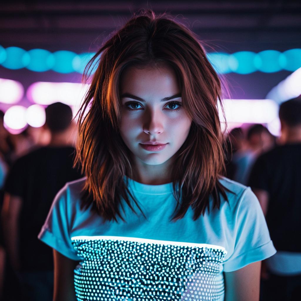 Close-up portrait of a young woman with brown hair wearing a futuristic rave outfit featuring glowing LED lights. She is looking directly at the camera with a confident expression. The background is blurred with vibrant neon lights and indistinct figures, suggesting a nightclub or rave setting.