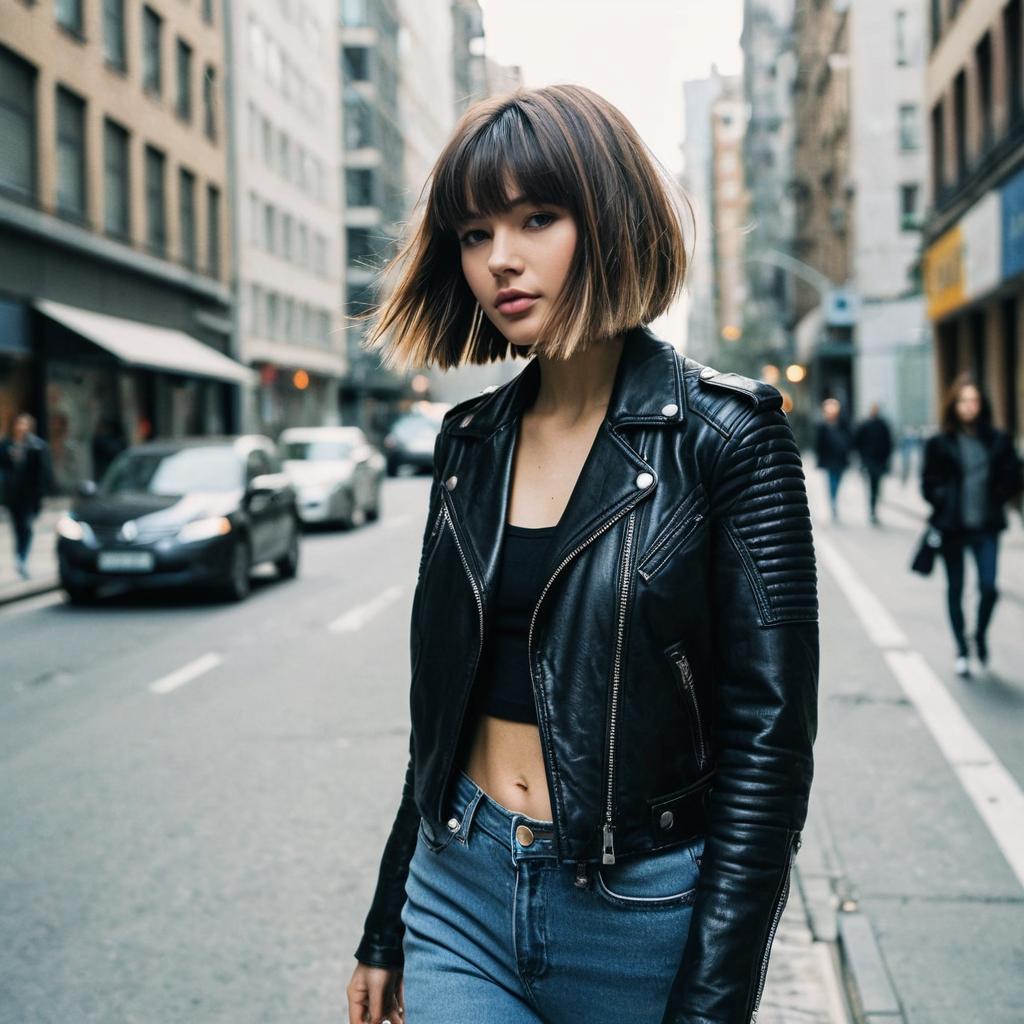Choppy Bob hairstyle on fashion model, wearing leather jacket and ripped jeans, in rooftop terrace, captured in fashion editorial style with golden hour light.