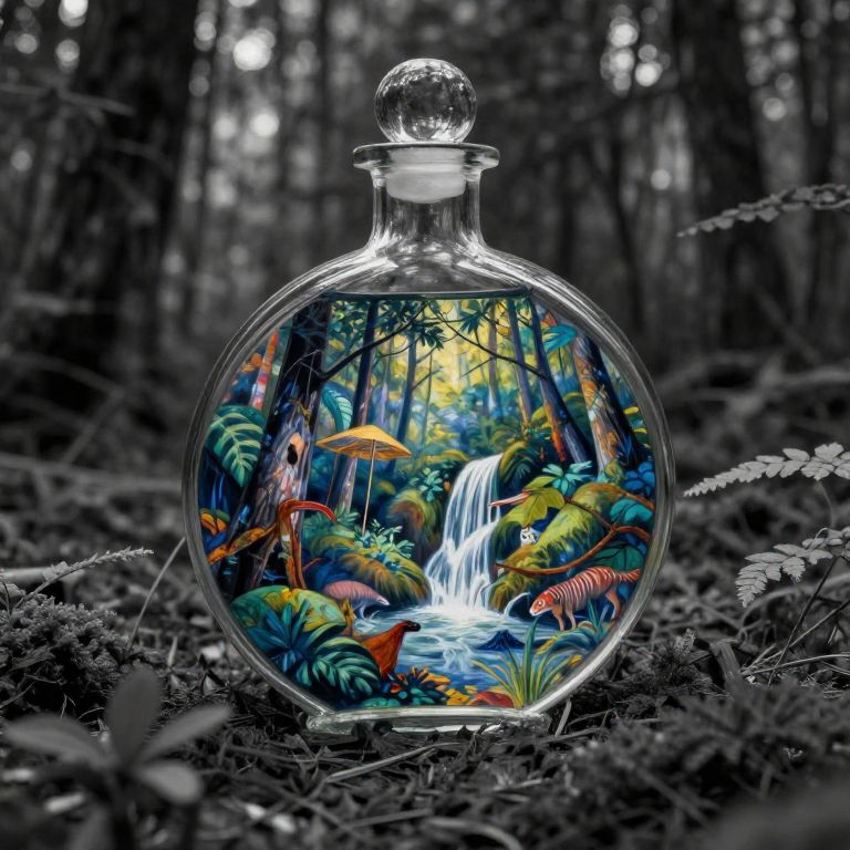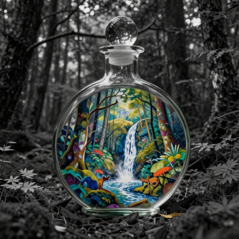Monochrome the deep forest, laid delicate colorful glass round bottle with a forest , wildlife, waterfall inside, realist, cinematic lighting, Georges Seurat, andrey remnev, paul Klee art,