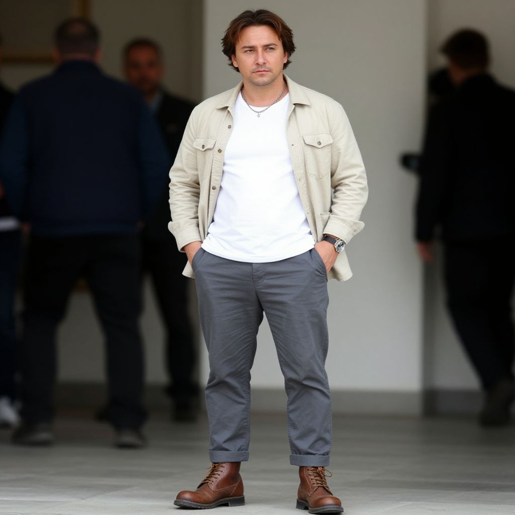 Man with brown hair wearing a brown jacket, red shirt and black pants. He is standing on a sidewalk next to a row of chairs. There is a black bag next to him.