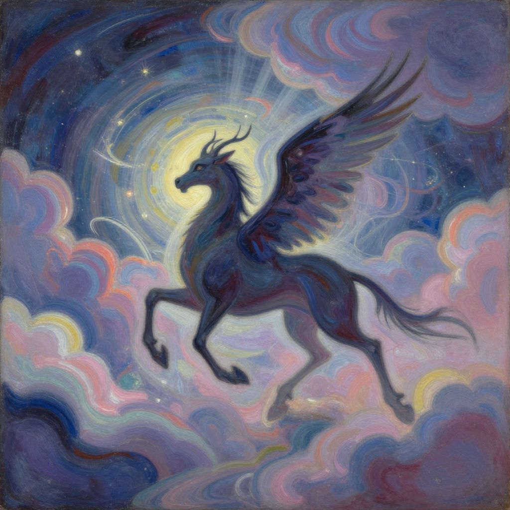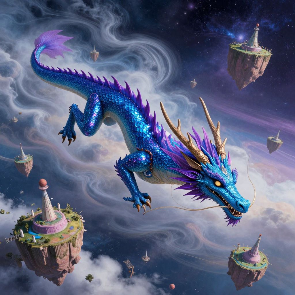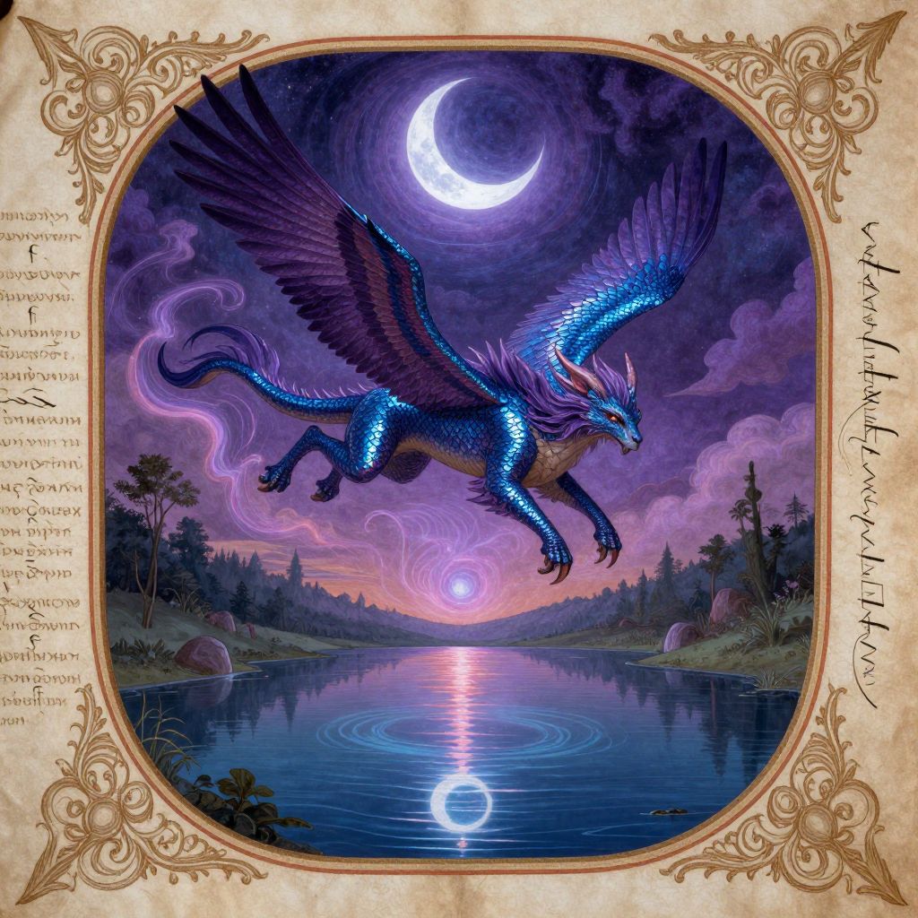 A grand mythical creature takes flight amidst a whimsical sky, its scales glistening with opulent shades of deep purple and vibrant blue under the enigmatic light of a crescent moon. The scene is masterfully crafted in the style of an illuminated medieval manuscript, featuring intricate calligraphy encircling the composition, invoking a sense of ancient lore and mystery. From a lofty viewpoint, we observe the creature as it elegantly descends towards a tranquil lake beneath, its mesmerizing reflection dancing upon the water's surface, creating an enchanting display of symmetry that defies our perception of reality. As the creature nears, tendrils of magical energy swirl around it, casting an alluring atmosphere and hinting at untold tales woven into the fabric of this captivating realm.