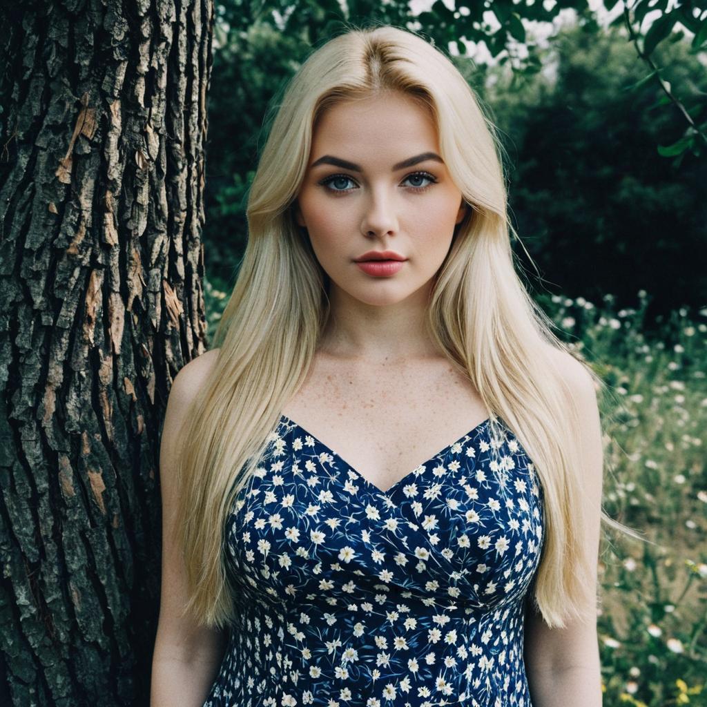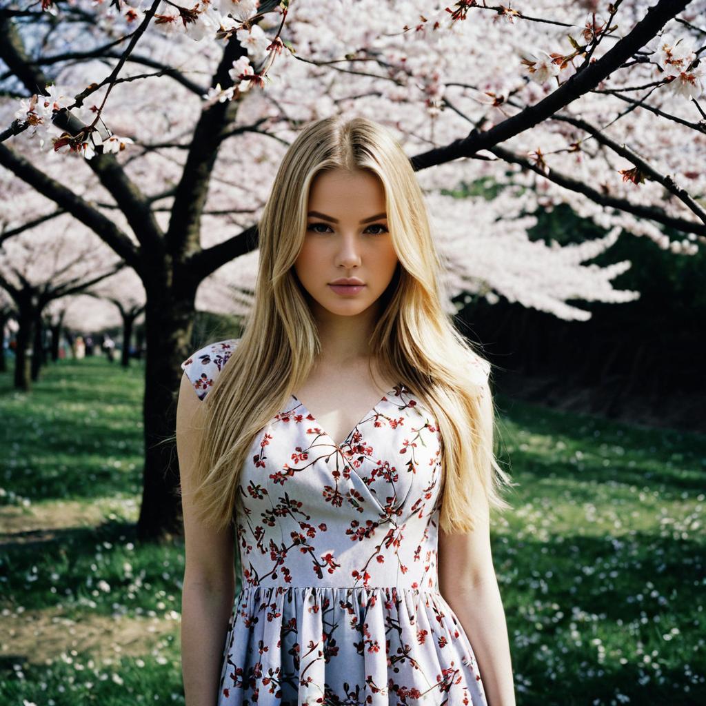 Portrait of a blonde woman with long hair wearing a floral print dress standing outdoors amidst blooming cherry blossom trees in a green park setting. The photo captures the realistic details of the blossoms and natural light.