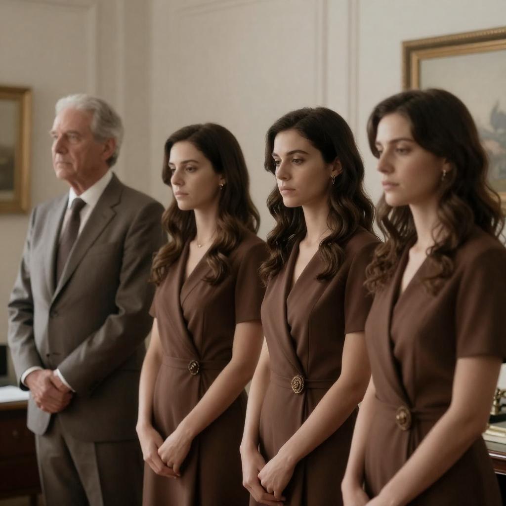 Photograph of a bedroom scene. Four women, two with dark hair and two with light brown hair, stand around a bed. Man in white robe lies in bed, covered with red blanket. Woman in green shawl leans over bed. Lamp on nightstand. Red curtains and white walls in background. One woman with light hair holds a beige shawl, looking serious. Two women in white robes stand behind. Red blanket and white pillow. Lamp casts warm light.