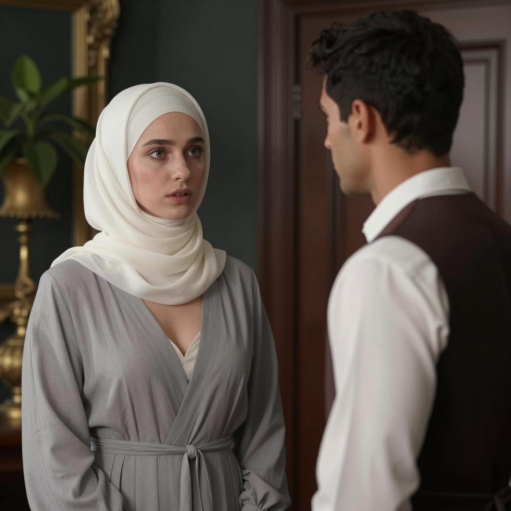 A man lying in bed covered with a red blanket and white robe is being attentively cared for by a woman wearing a green shawl. Two other women in white robes stand nearby, one holding a beige shawl, all in a warmly lit bedroom with red curtains, white walls, and a bedside lamp.
