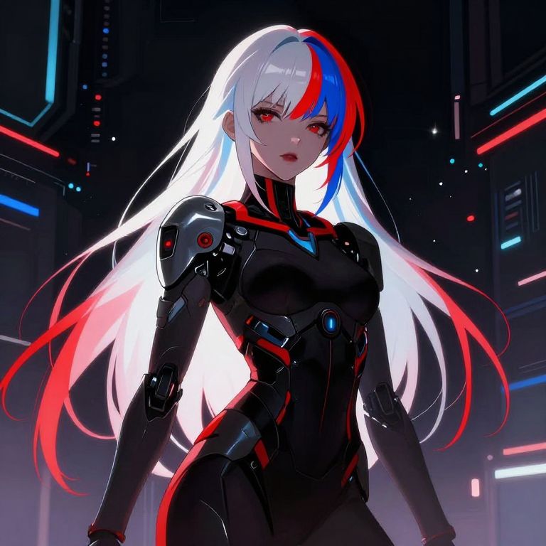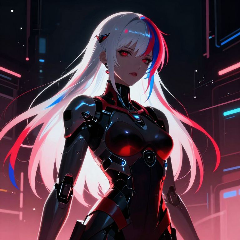 Digital anime-style illustration of a futuristic female android with long white hair, streaked with red and blue highlights. She has red eyes and wears a form-fitting, black, glossy bodysuit with glowing red accents. Her expression is serious and focused. The background is a dark, neon-lit cityscape with glowing pink, blue, and purple lights, adding to the cyberpunk atmosphere. The android's hair and bodysuit reflect light, enhancing her sleek, mechanical appearance. The image has a high-contrast, vibrant color palette and sharp, dynamic lines.