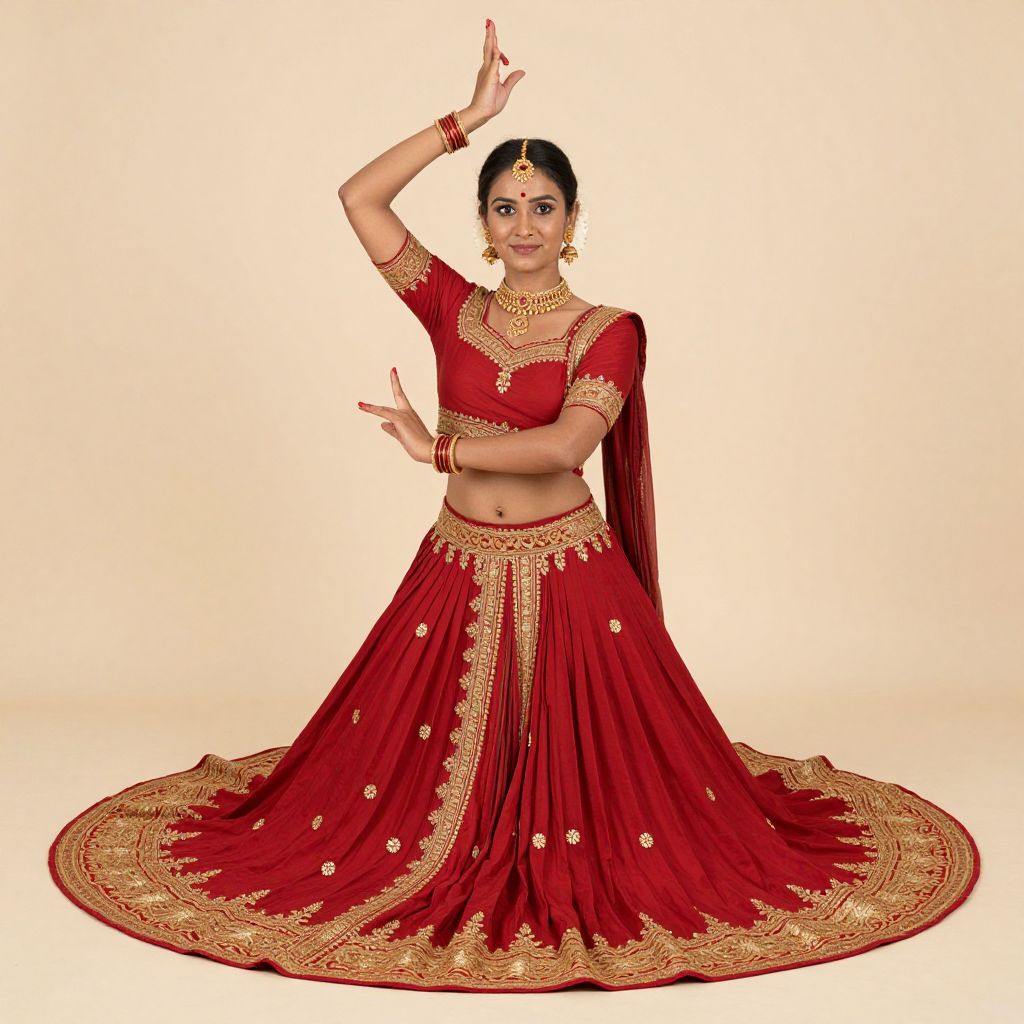 Mudra Dance Costume, a woman in a traditional indian costume is posing for a picture