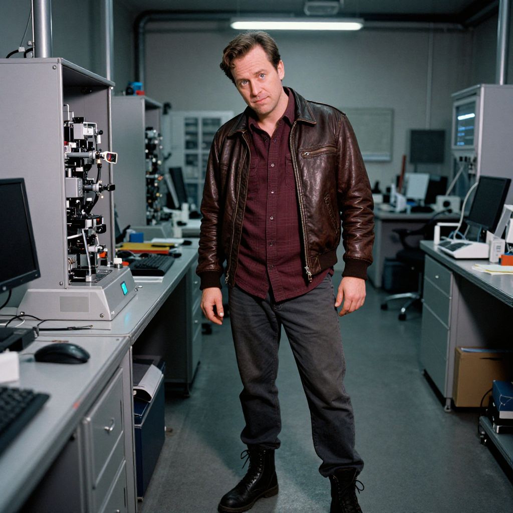 A man, edgy urban explorer, leather bomber jacket, burgundy flannel shirt, dark grey chinos, combat boots, robotics lab, sleek metal surfaces, buzzing machinery, kodachrome analog film, focused expression, slight smirk. Man has masculine face and piercing eyes