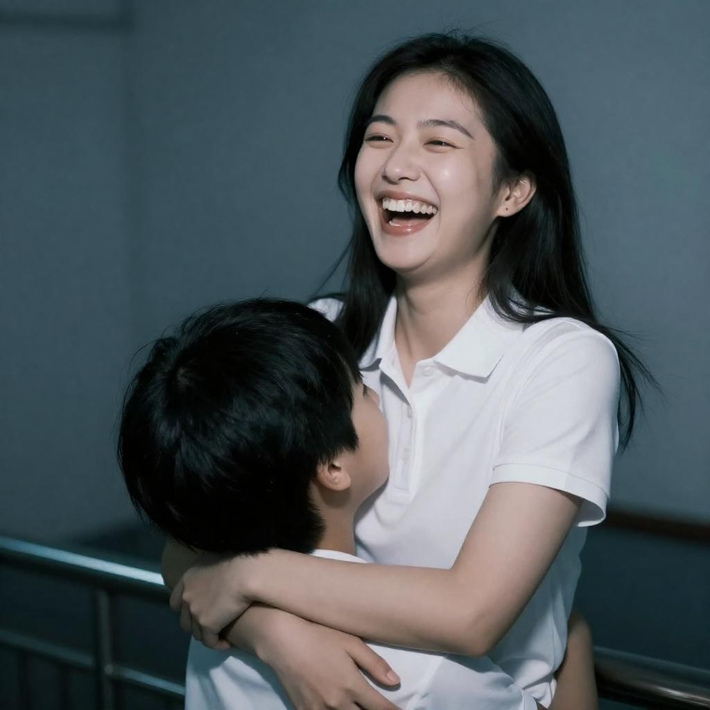 Young couple in an intimate embrace outdoors during the night with city lights blurred in the background. Blonde woman in a white sleeveless top smiling while wrapping her arms around a man with short black hair wearing a black shirt. Romantic and tender moment captured against a dark backdrop.