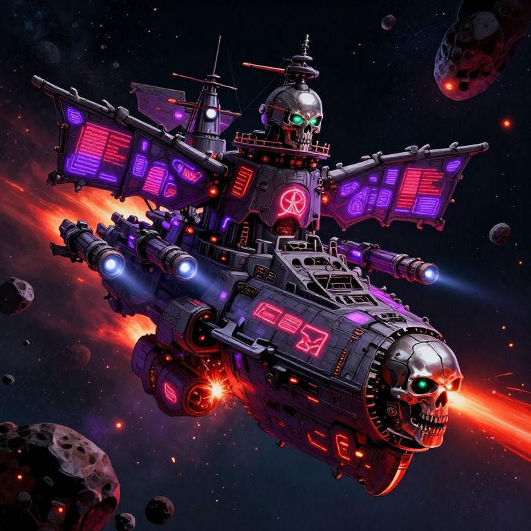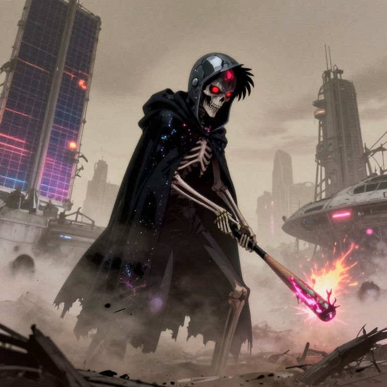 This is a digital illustration with a dark, futuristic theme, executed in a detailed, comic book style, The central figure is a robotic skull, intricately designed with an array of mechanical parts and glowing red eyes, The skull is adorned with various cylindrical and spherical components, including what appears to be a rocket launcher on top, spewing smoke or exhaust, Green smoke plumes from the skull's head and neck, adding a dynamic, almost menacing feel to the image, The background features a dark, industrial cityscape with towering skyscrapers and smokestacks, all rendered in dark shades of green and black, The sky is a deep, ominous red, enhancing the sense of danger and chaos, The cityscape is partially obscured by thick, dark clouds and smoke, contributing to the overall gritty and dystopian atmosphere, The illustration combines elements of cyberpunk and steampunk aesthetics, with a focus on mechanical details and a dark, industrial color palette, The textures are smooth and detailed, with sharp lines and shadows that emphasize the depth and complexity of the image, The artist's signature is visible in the lower right corner, style of Edward Gorey