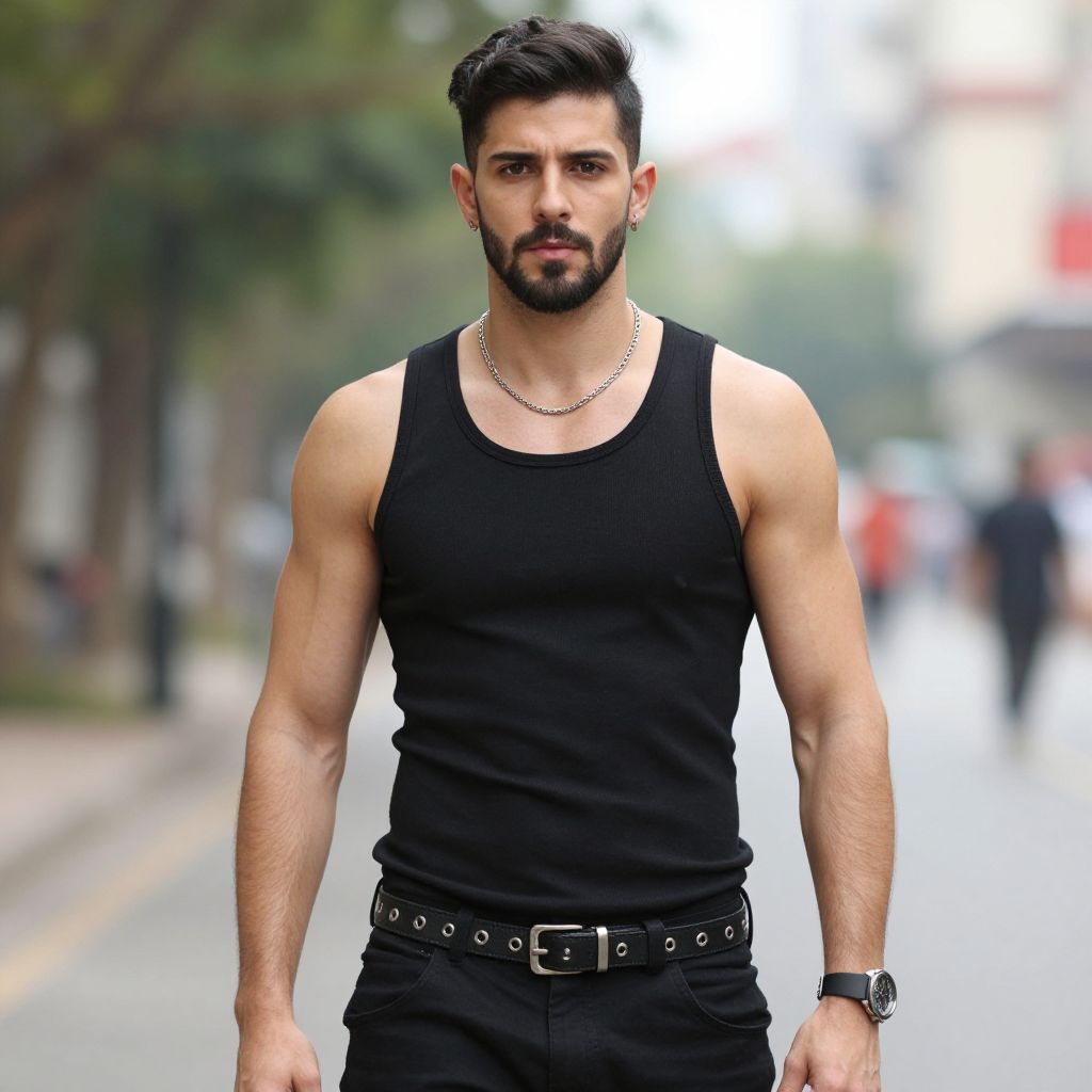 Tank top outfit man costume, 1boy, male focus, solo, facial hair, tank top, beard, pants, outdoors, belt, jewelry, muscular, looking at viewer, black hair, earrings, black tank top, short hair, realistic, blurry, mustache, wristwatch