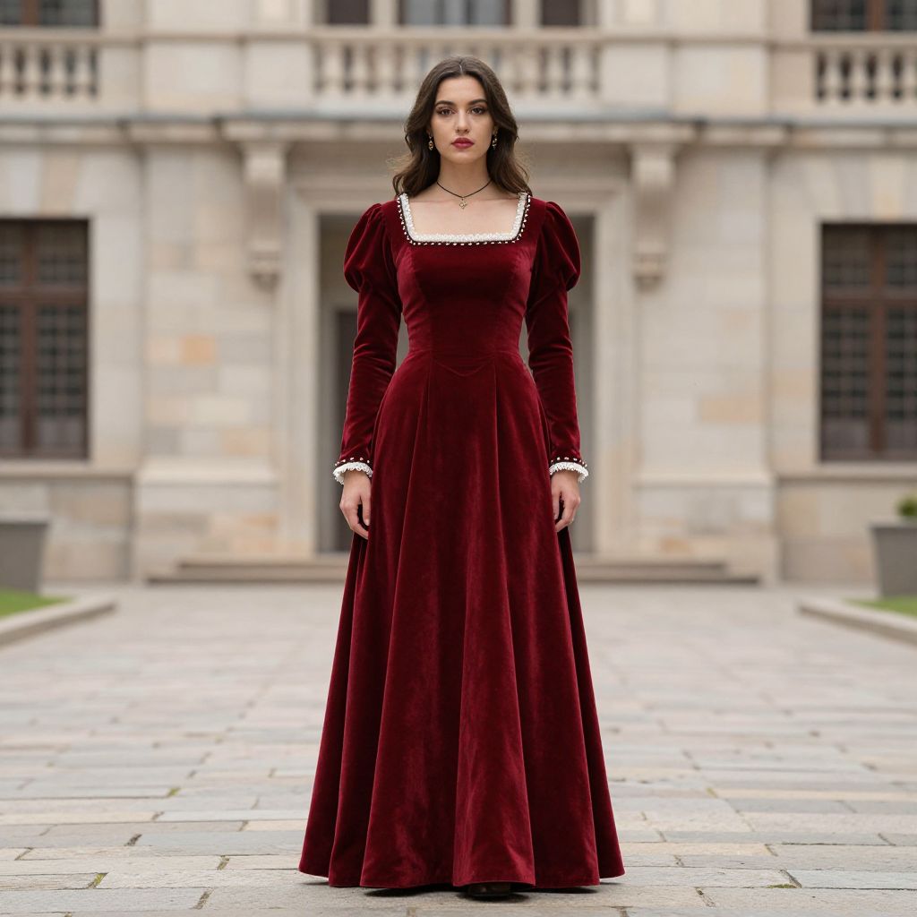 Red Velvet Medieval Dress, woman in a red dress standing in front of a building