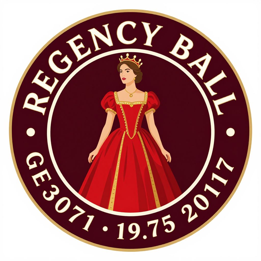 Circular emblem featuring a woman in a regal red dress, surrounded by text reading \"REGENCY BALL GEENDU 13071 • 19.75 20117,\" set against a deep maroon background.