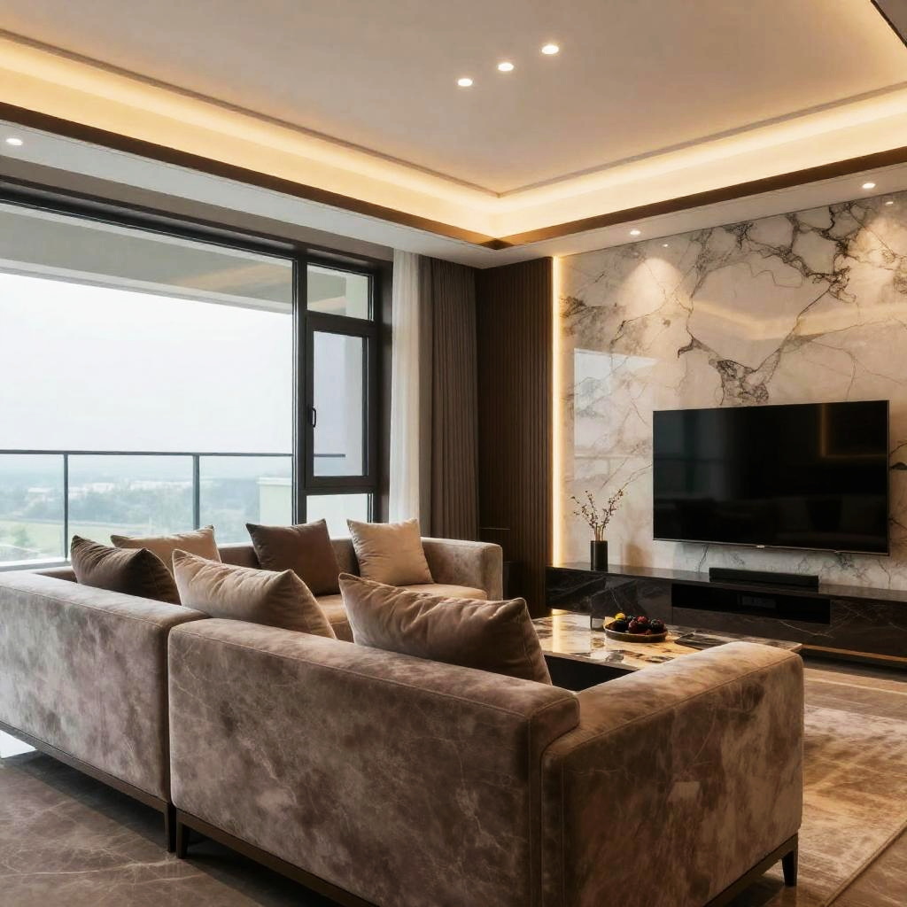 Ultra realistic, masterpiece, best quality, super detailed, ultra high res, raw photo, 8k, a modern livingroom, (fabric sofa), (fabric pillow), stone opaque resin panel, brown and white, luxury, in the style of enchanting lighting, light gold and light black, li shuxing, traditional-modern fusion, soft atmospheric light, hard-edged lines, (window), fabric window blinds, blue sky, 1 black TV, 32k, extremely detailed CG unity 8k wallpaper