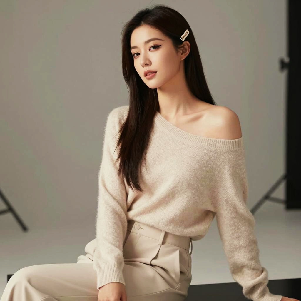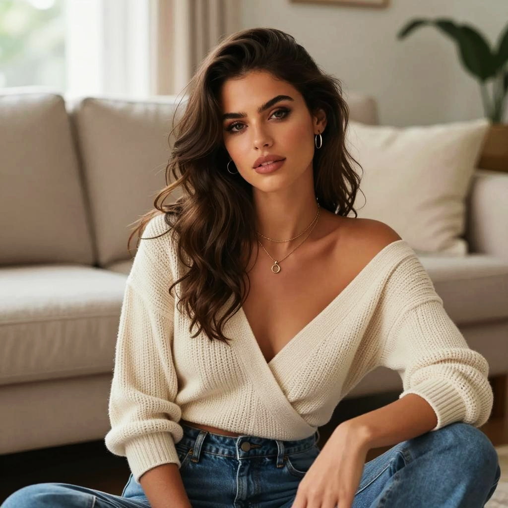 Victoria's Secret style inspiration, three-quarter portrait of a relaxed woman seated casually, brunette woman with side-parted waves and subtle smokey eyes wearing soft cashmere sweater falling off one shoulder with tailored trousers with small hoop earrings and layered necklaces in cozy living room with soft-focus sofa and cushions under gentle window light wrapping around her face, soft editorial fashion photography, high resolution, ultra-detailed