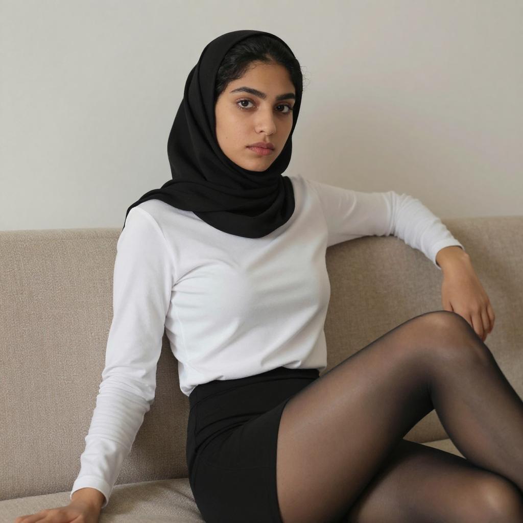 Photograph of a young woman with light brown skin and dark hair in a black hijab, sitting on a beige couch. She wears a white long-sleeve top, black skirt, and black sheer stockings. Her right arm rests on the couch's back, and she gazes directly at the camera with a neutral expression. The background is a plain, light-colored wall.