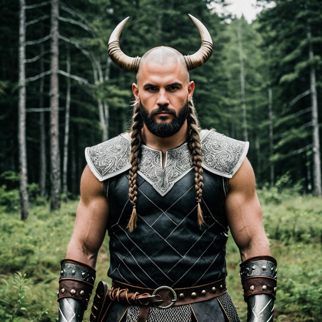 Muscular adult male dressed in a detailed Viking costume with horned headgear, braided beard and hair, standing in a lush green forest. The costume includes intricately designed leather armor with metal accents and wrist guards. The man appears fierce and focused, with a bald head and twin braids, embodying a traditional Viking warrior look in an outdoor natural environment.