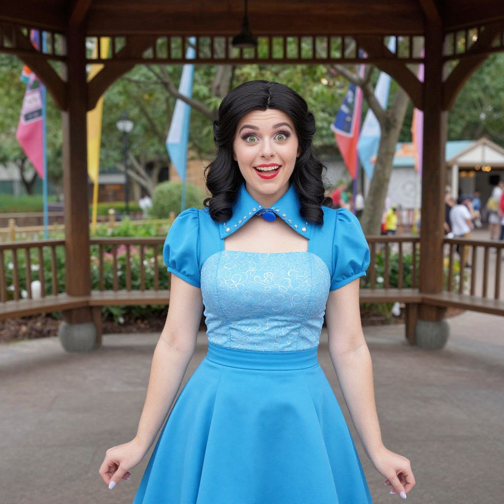 This is a digitally enhanced photograph of a woman with fair skin and dark, wavy hair styled in vintage curls. She wears a bright blue, short-sleeved, Victorian-style dress with a high collar and lace detailing, and a full skirt. She has large, expressive brown eyes, red lipstick, and a joyful smile. The background features a wooden gazebo with colorful flags and greenery, suggesting an outdoor park setting. The image has a slightly exaggerated, cartoonish style, with enhanced colors and features.