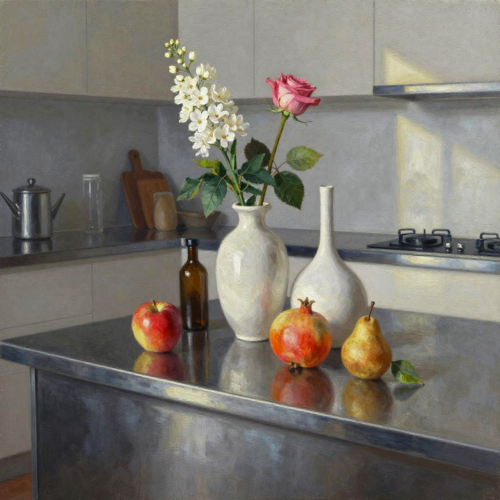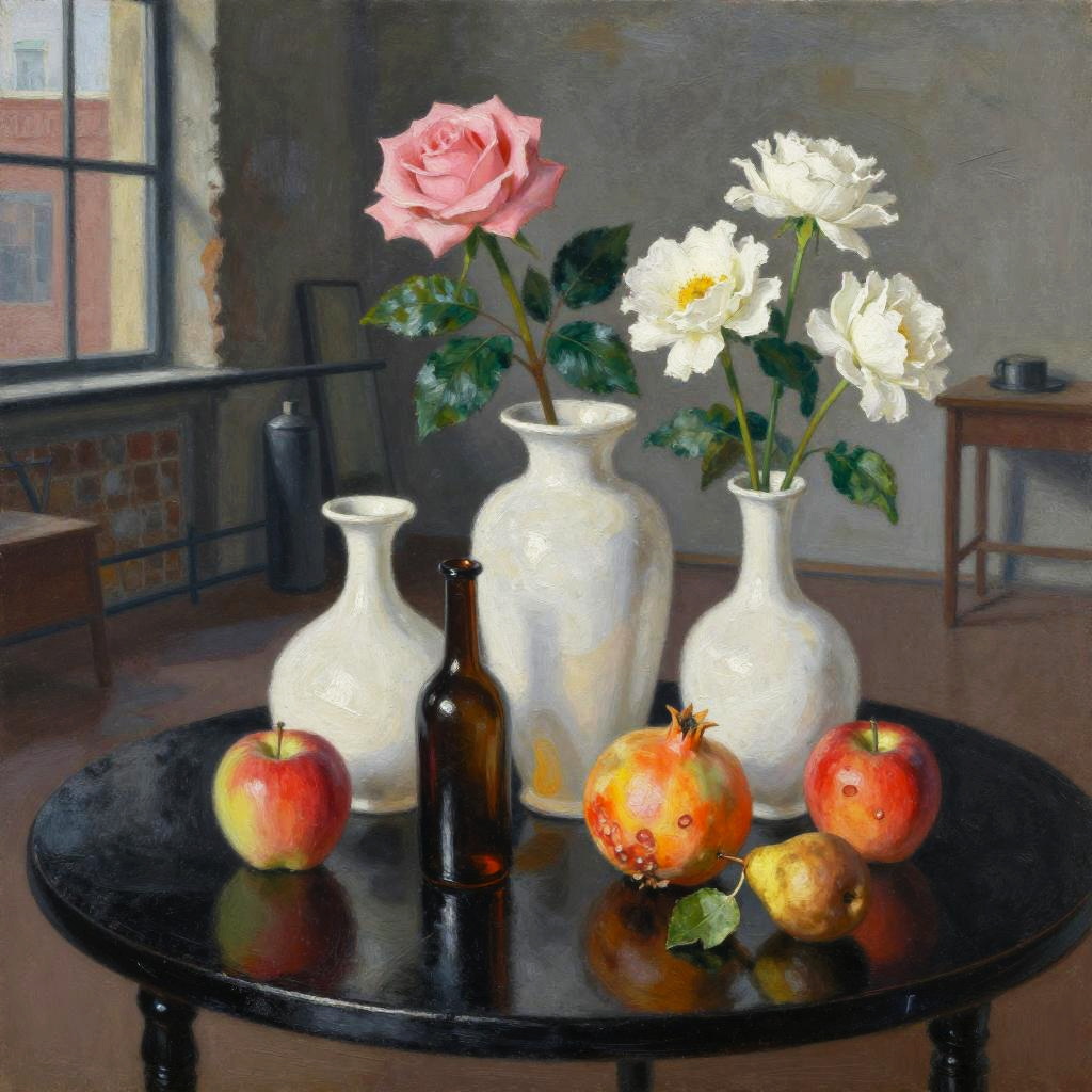 Modernist gouache painting, black lacquer table in an industrial urban loft, still-life featuring three white vases of varied shapes and a small brown bottle with a dark top; pink roses and white flowers with lively green leaves; fruits arranged around them: a red apple, a yellow-orange pomegranate, another red apple, and a small brown pear with a green leaf; mixed natural and warm tungsten light; realistic textures, crisp edges, gentle reflections, soft falloff, color-true, editorial quality