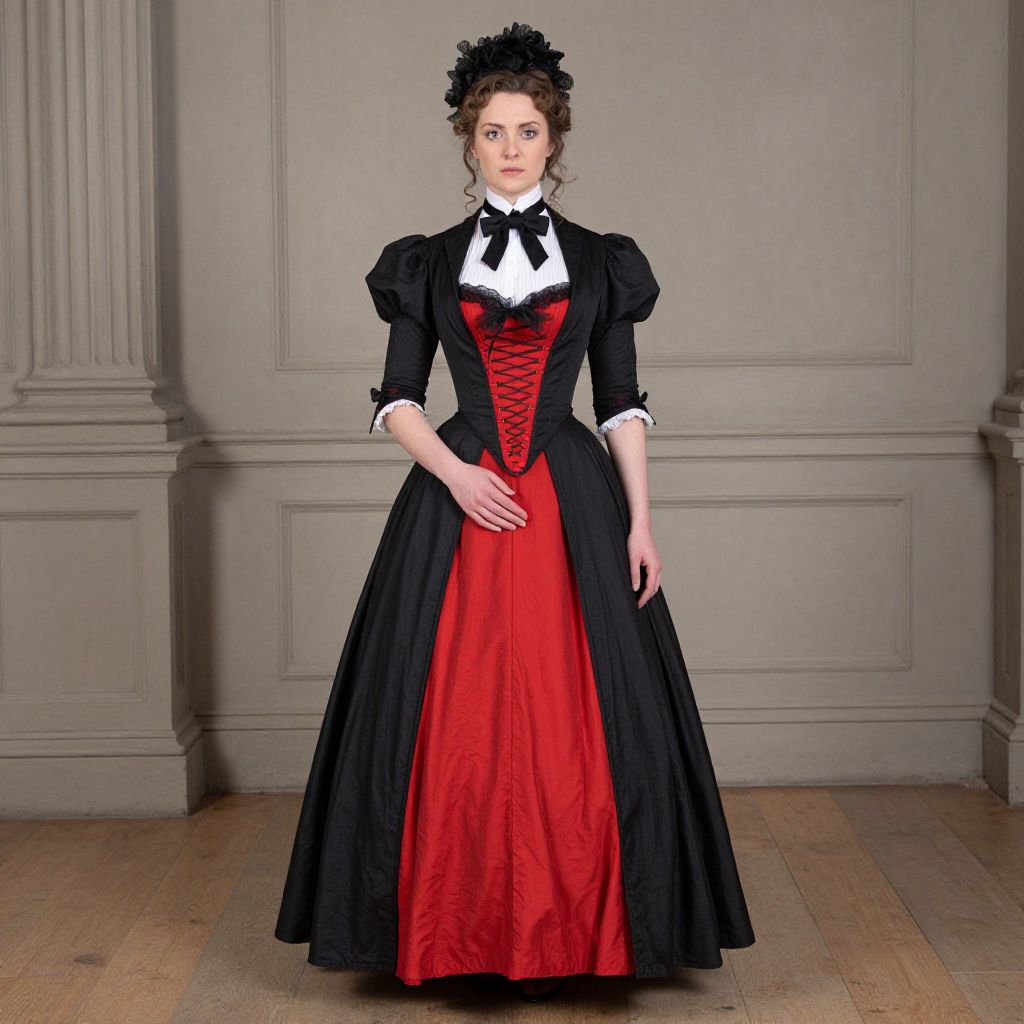 "Victorian Dress Fancy, woman in a black and red dress with a bow tie"