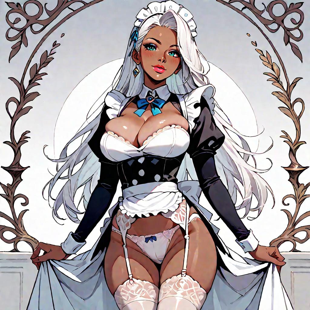 Masterpiece, best quality, highly detailed, score_9, score_8_up, score_7_up, score_6_up, source_Anime, solo, long hair, breasts, smile, blue eyes, thighhighs, very long hair, underwear, panties, white hair, dark skin, large breasts, dark-skinned female, maid, maid headdress, garter straps, bursting breasts