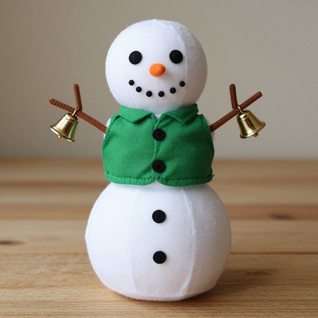 Photograph of a white, fuzzy, knitted Christmas reindeer with black hooves, wearing a gold collar and red star-shaped green wreath,