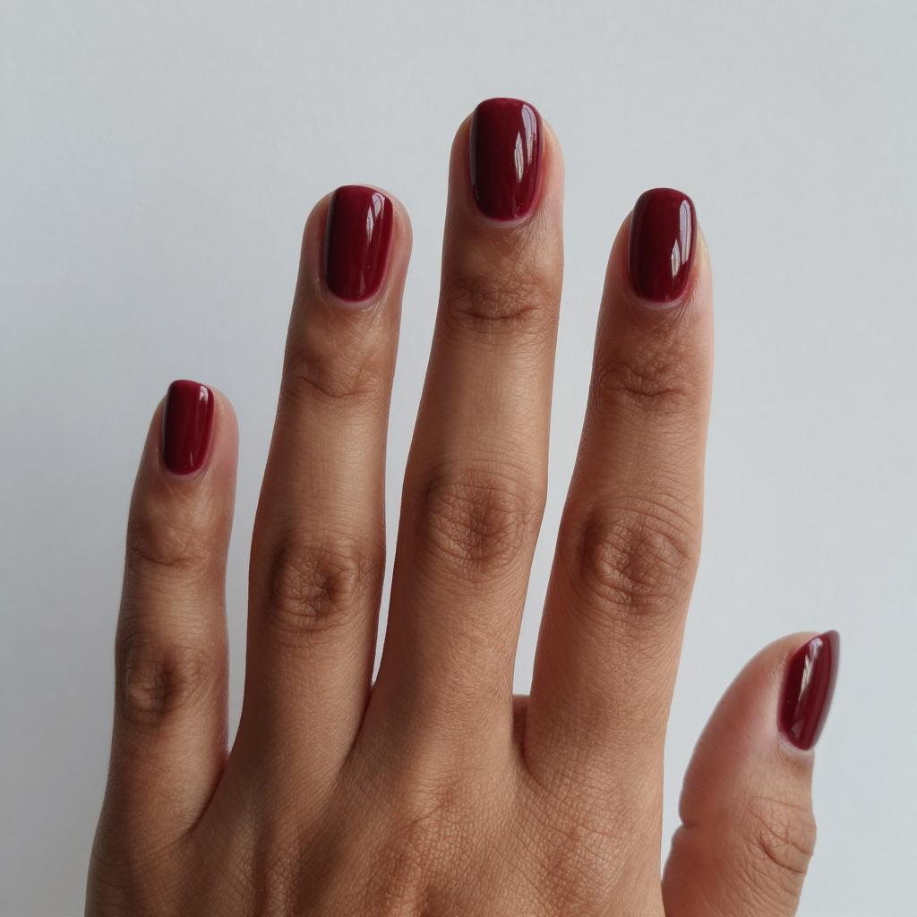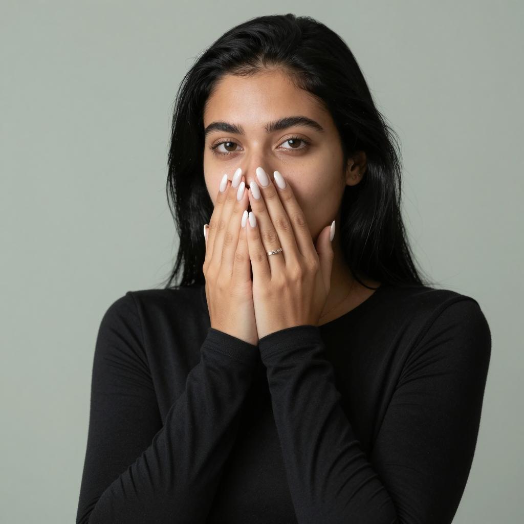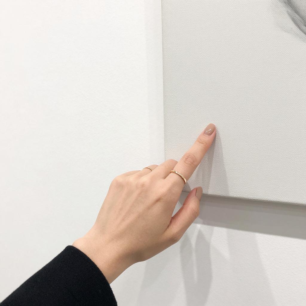Photograph of a hand with light brown skin, long white nails, and a gold ring on the middle finger. Hand is giving a thumbs-up gesture. Wearing a black, glossy, long-sleeve jacket. Background has a ured, gray, rectangular canvas on a white wall.