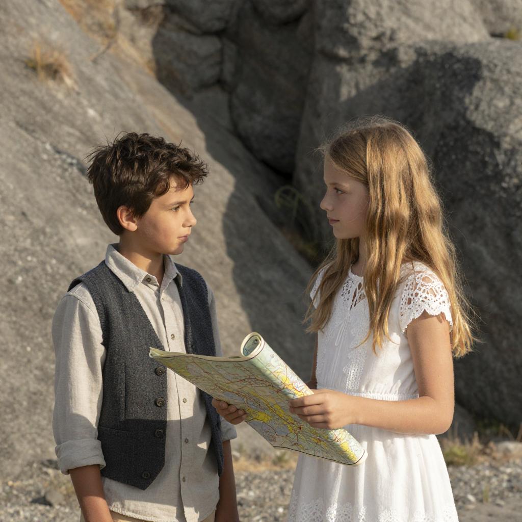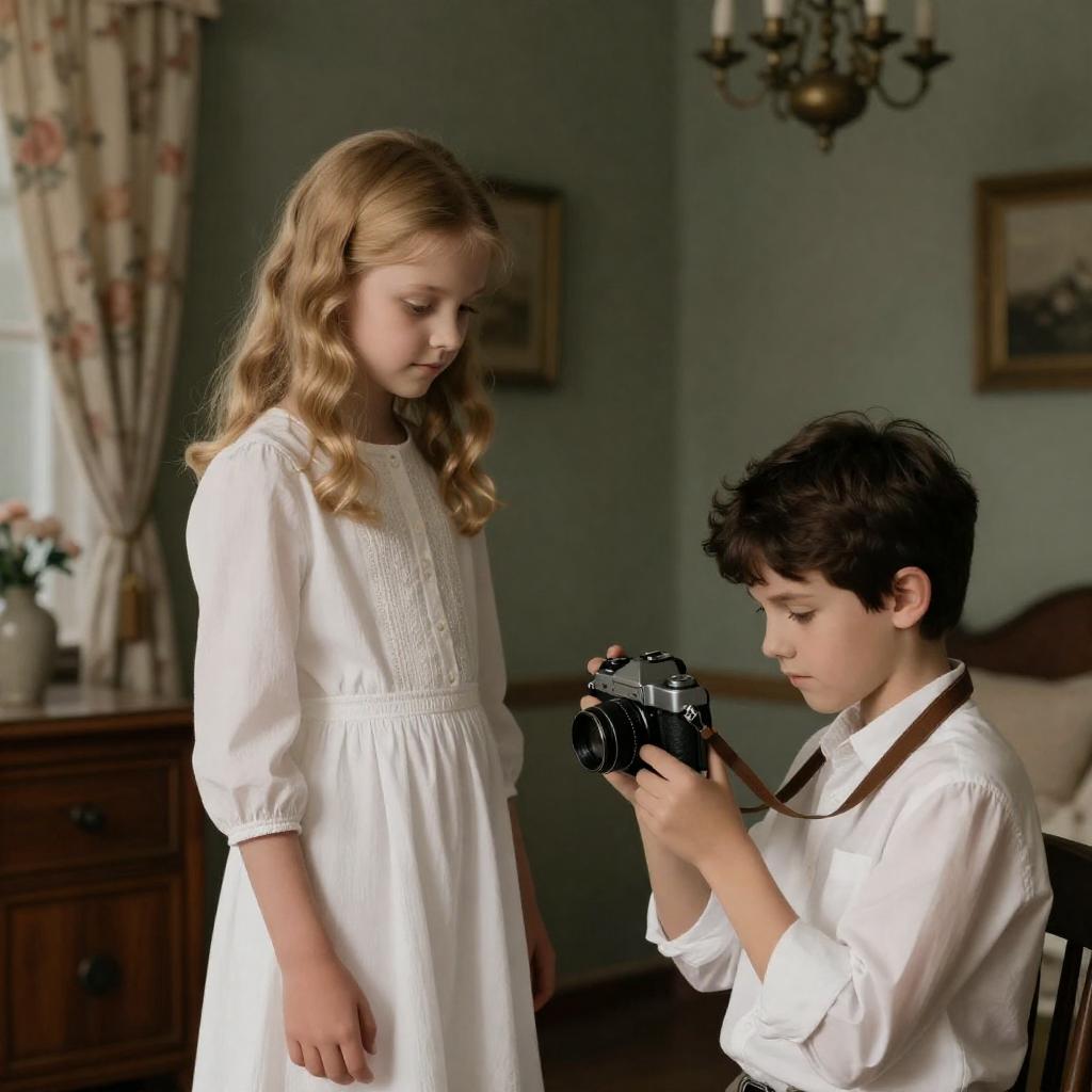 Photograph of a young blonde girl in a white, long-sleeved dress standing beside a young boy with dark hair, wearing a white shirt, operating an old-fashioned film camera. They are in a dimly lit, vintage room with floral curtains, a wooden cabinet, and a chandelier in the background.