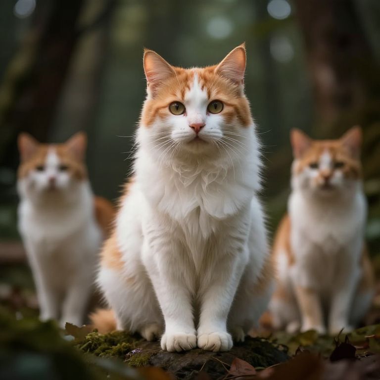 Photograph of three orange-and-white long-haired cats standing in a forest, with one in sharp focus and two blurred in the background, on a leaf