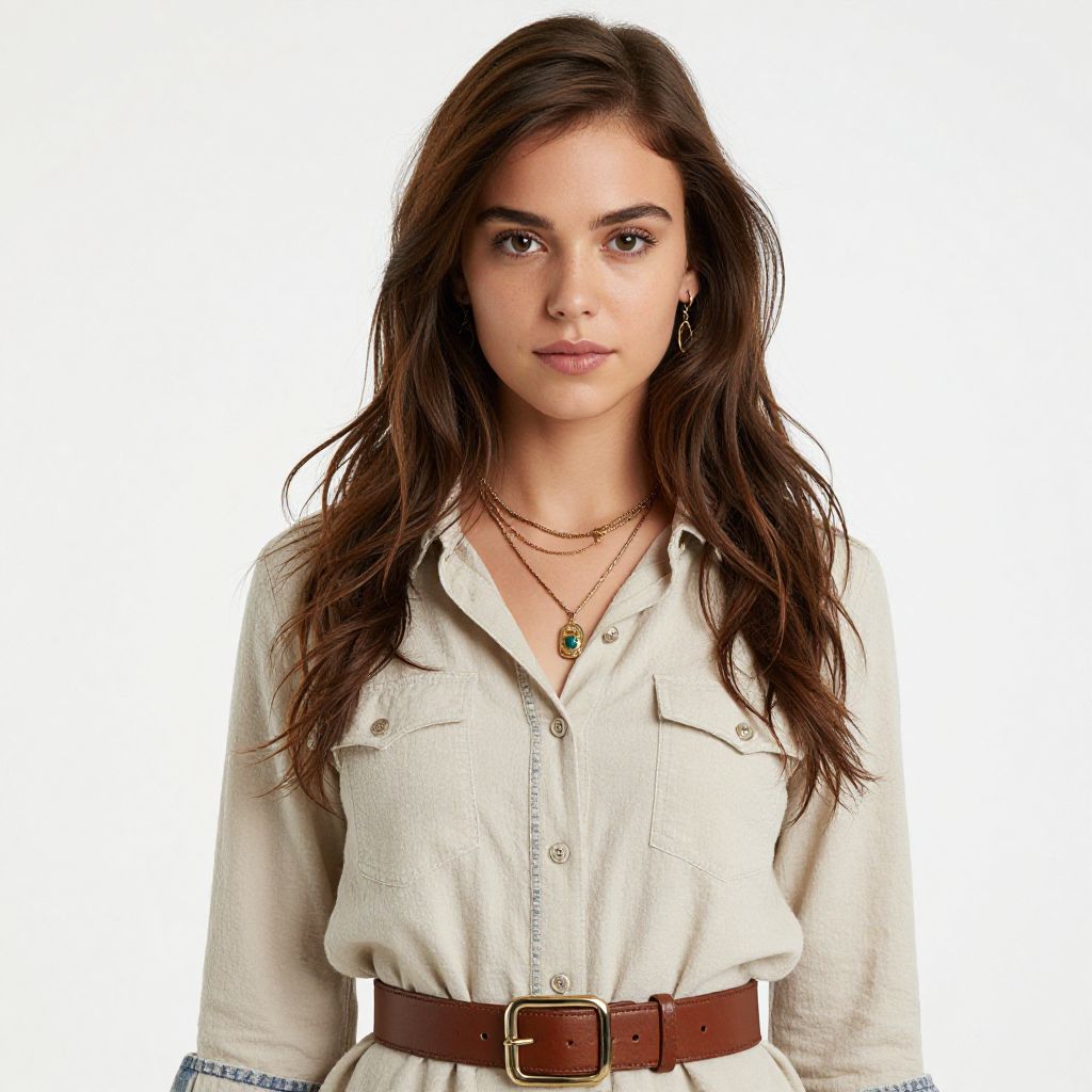 Photograph of a young woman with long brown hair, wearing a white button-down shirt, brown belt, layered necklaces, and white background.