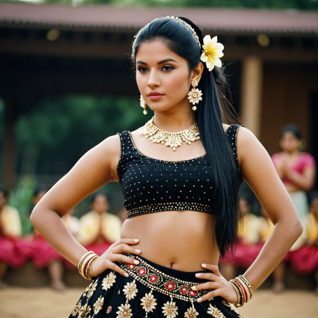 Western bollywood dance,1girl, solo, flower, hair ornament, hair flower, hands on own hips, black hair, long hair, realistic, side ponytail, blurry background, jewelry, blurry, lips, skirt, earrings, crop top